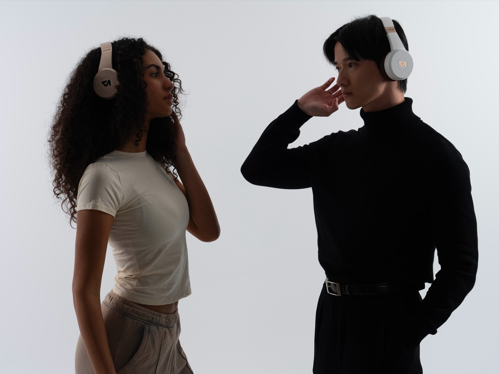 Studio photographs featuring models against a white background, intended to showcase the sharing feature of Viwone headphones.